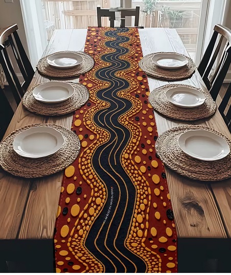 Tischläufer mit aborigines inspirierter, lebendiger Punkte- und Spiraldesign - Polyesterstoff