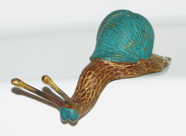Eine süße Schnecke kriecht über Kanten oder schaut ihnen vom Regal aus über die Schulter. Aus massiver Bronze mit grün-braun-goldenem finishing.