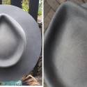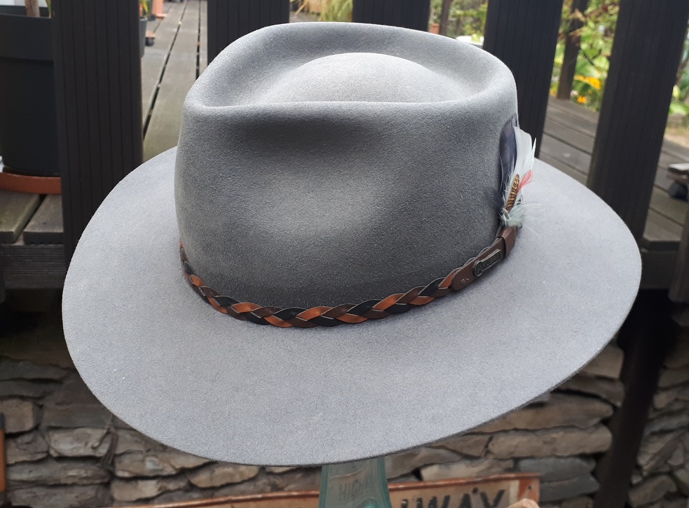 Ein Akubra Hut wird aus Pure Fur Felt, also reinem- oder 100% Kaninchenhaar-Filz hergestellt. Dies ist von Natur aus extrem widerstandsfähig und weitgehend regendicht. Imprägnierspray ist daher gänzlich überflüssig. Egal ob Regen oder Sonnenschein, den "Akubra" können Sie bei jeder Witterung tragen. Den nassen Hut möglichst bei guter Belüfttung trocknen lassen. Heizung oder Fön sind out. Verschmutzungen entfernt man am leichtesten mit einer Bürste und kreisenden Bewegungen entgegen dem Uhrzeigersinn. Damit der Akubra seine Form behält, sollte er nicht auf die Krempe gelegt werden und schon garnicht im PKW auf die Ablage. Falls er doch mal die Form verliert, kann man schon mal vorsichtig selbst mit heißem Wasserdampf nachhelfen (z.B. Dampfbügeleisen oder Wasserkessel). Im Zweifelsfall sollte man das natürlich den Fachleuten überlassen.